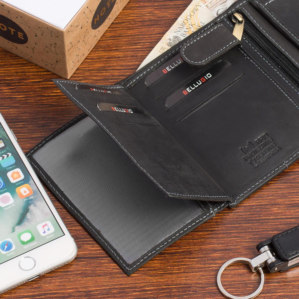 Autentyczność i jakość potwierdzają dwa eleganckie tłoczenia: „Genuine Leather” – gwarantujące wykonanie z prawdziwej skóry naturalnej najwyższej klasy oraz „RFID Secure” – świadczące o zastosowaniu technologii zabezpieczającej dane z kart zbliżeniowych przed nieautoryzowanym odczytem.